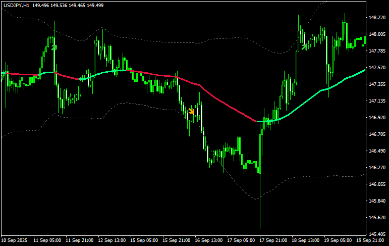 MAについては向きによって色が変わり、ローソク足の実体がバンドをブレイクするとサインが出ます。