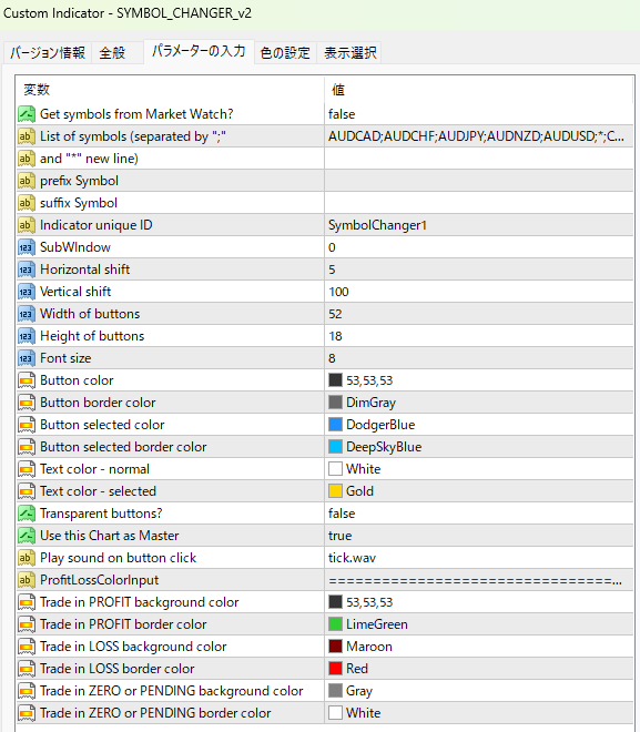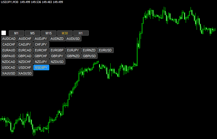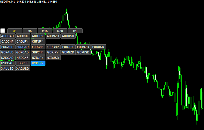 チャート上のボタンをクリックすることで時間足や通貨ペアを変更できるインジです。