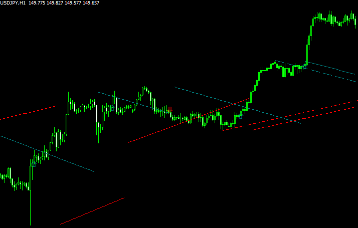このインジケーターの描画するトレンドラインはかなり独特で、多くのラインを描画します。