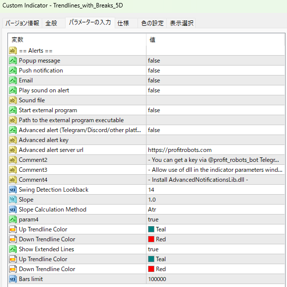 癖のあるトレンドラインとサインを出す「Trendlines_with_Breaks_5D」