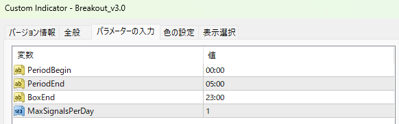 デフォルトでは0時から5時までの時間帯のレンジについて、23時までにそれをブレイクしたらサインが出ます。