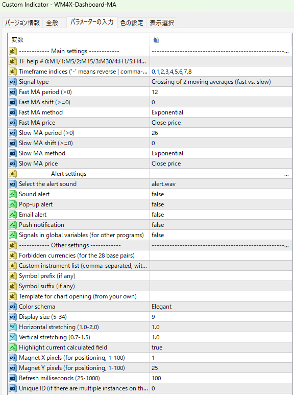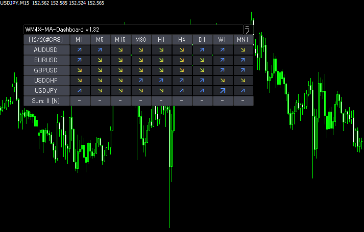 マルチタイム・マルチ通貨ペアで2本のMAの方向を一覧で示す「WM4X-Dashboard-MA」