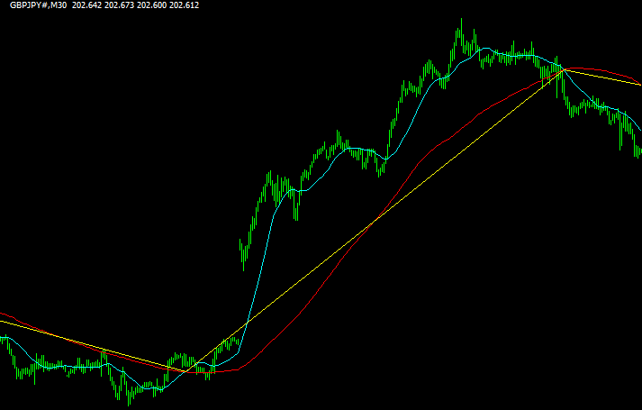 このインジを利用することで、2本の移動平均線のクロスのポイントや大きな流れが視覚的に分かりやすくなります。