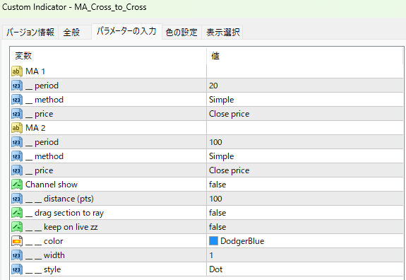 デフォルトでは20SMAと100SMAとなっていますが、MAの種類や期間は変更が可能です。