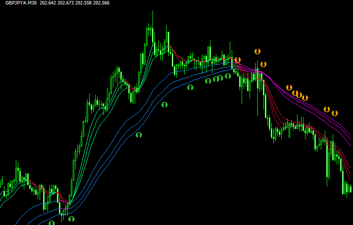 6本の移動平均線を表示し、トレンド方向とRSIの条件が重なるとサインが出るインジです。