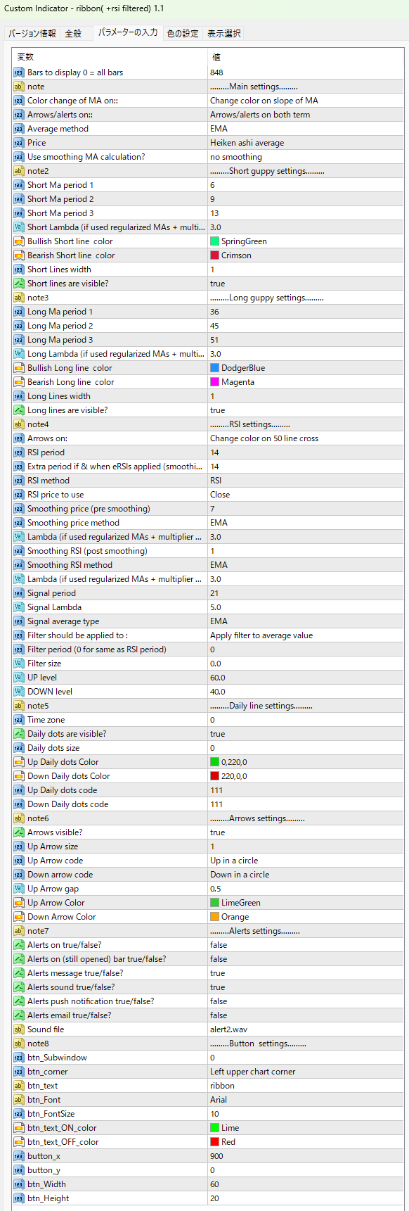 各移動平均線の期間や種類、RSIのパラメーターやスムージングなど、サインが出る条件などは変更ができますので、好みに合わせて調整が可能です。