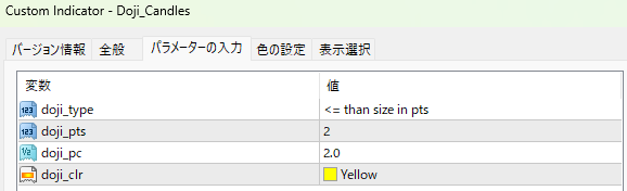 このインジでは同時足の条件について、実体のサイズと全体に占める割合を細かく決めることができます。