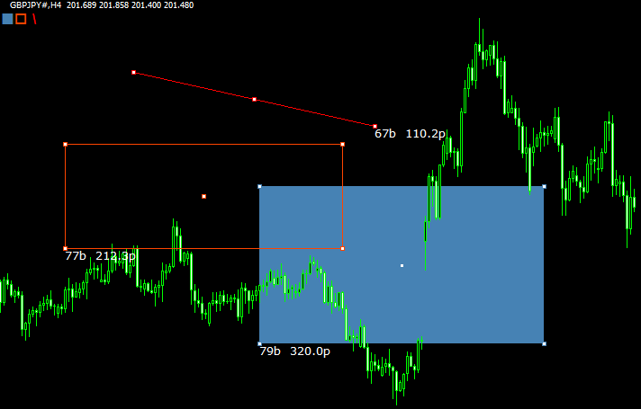 トレンドラインやレクタングルについては、その期間のバーの数や値幅も表示します。