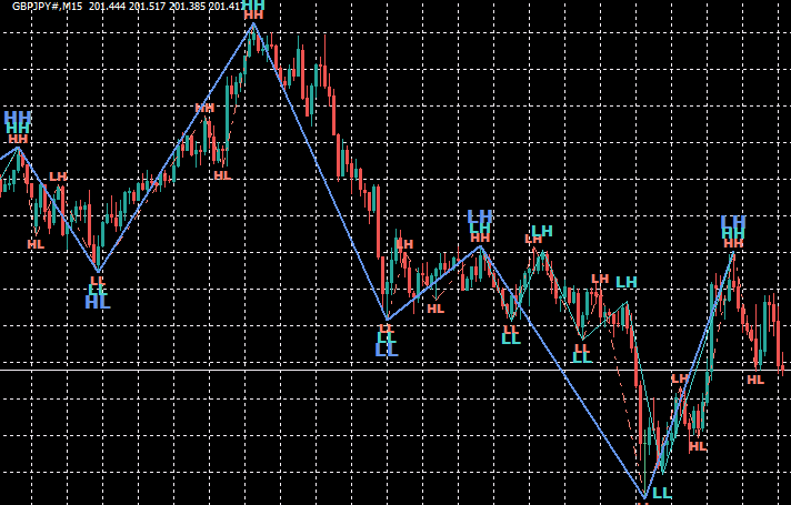 短期、中期、長期の3つの期間のジグザグを表示し、それぞれの波の高値・安値についてHH~LLの表記をするインジです。