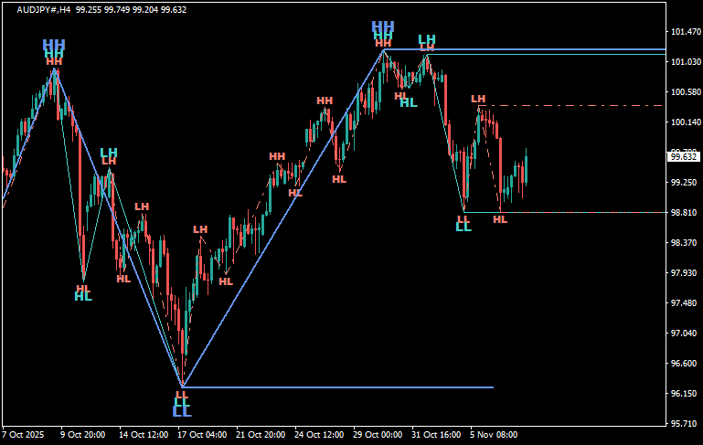 - LL(Lower Low|安値更新):直前のスイング安値よりも低い安値。