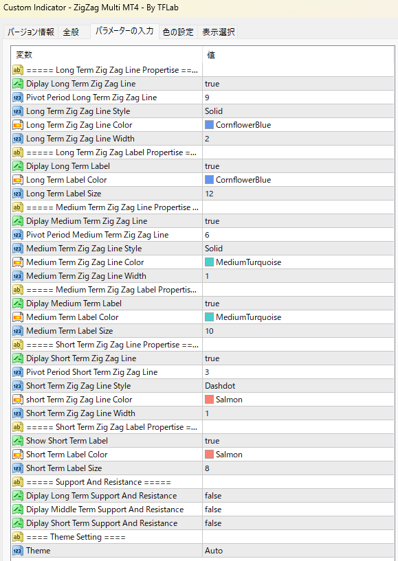 この他にも、設定で直近のスイングの高値・安値からサポレジラインを表示することもできます。