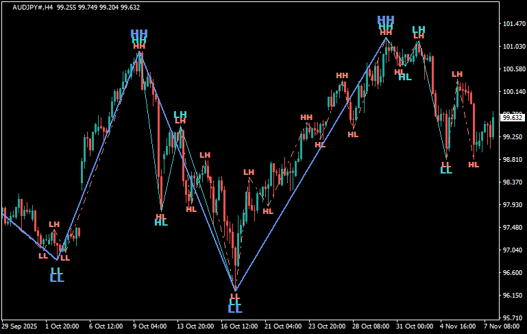 - HH(Higher High|高値更新):直前のスイング高値よりも高い高値。