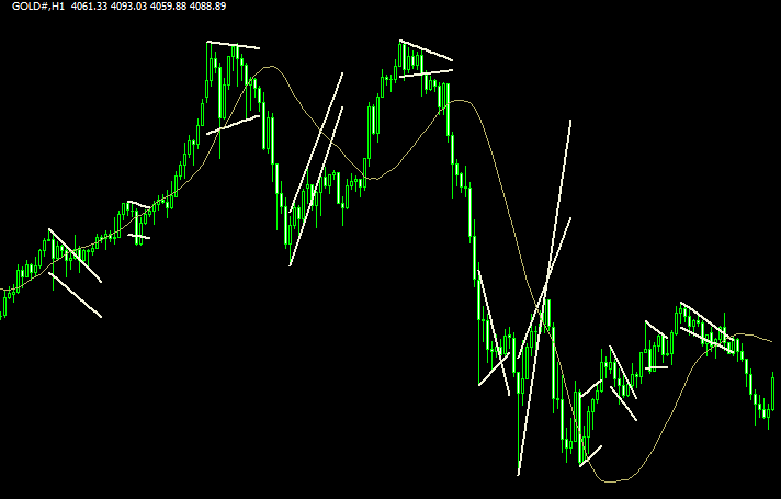 ペナントは白いライン、フラッグは緑色のラインで表示し、それに加えて現在の大まかな流れを示す移動平均線のようなスロープも表示します。