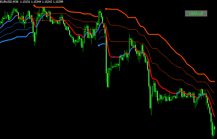 ultimate-maとは、複数の長さの移動平均線を組み合わせたもので、ボラが大きいときには早く動き、ボラが小さいときにはゆっくりと動くように設計された移動平均線です。