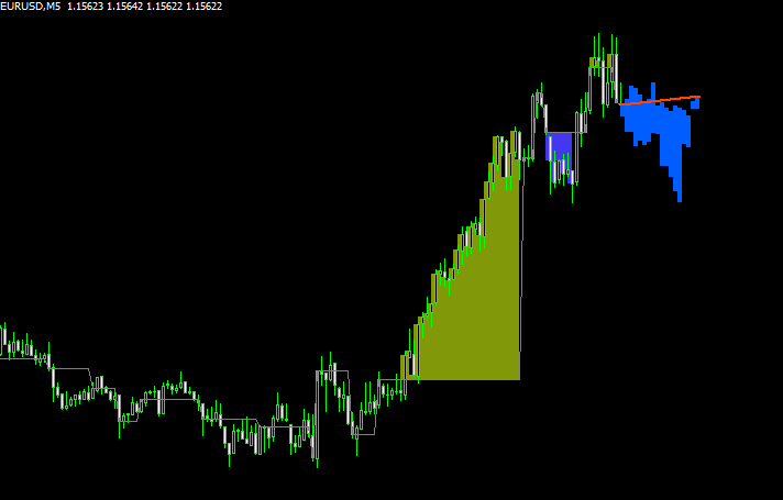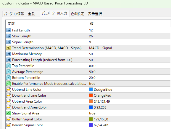 灰色のラインは過去のMACDのトレンド転換が生じたときの価格の推移を示し、現在の足の先に示される青いゾーンは予測領域になります。