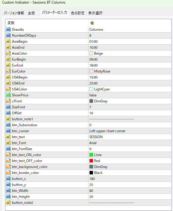 ボックス2025.11.28指定した時間帯の背景色を変える「Sessions BT Columns」 ポスト シェア はてブ 送る Pocket各セッションの背景色を変えるインジです。指定できる時間帯は3つで、背景色も自由に変えられます。類似のインジでセッションの時間帯と価格帯を四角で囲んだりするものもありますが、このインジは時間帯の背景を変えるだけになります。そのため機能としてはよりシンプルになるものの、好みに合わせて背景色を変えることで、特定の時間帯だけのトレードや検証がしやすくなります。また、ボタンクリックで表示のオンオフも可能です。パラメーター設定 Sessions BT Columnsのダウンロード トレード手法10個+インジをプレゼントします!!当サイト経由でXMのリアル口座を開設された方に、非常に優位性の高いトレード手法を10個+他では絶対に手に入らない自作インジケーター等をまとめたサイト「Forex Standard Club XM版」にご招待します。詳しくはこちらインジケーターのインストール方法インディケーターをダウンロードします。ダウンロードするファイルはzip形式です。zipファイルを解凍し、mq4もしくはex4のインディケーターファイルを取り出します。MT4を起動して、画面左上の「ファイル」より「データフォルダを開く」をクリックします。その中の「MQL4」フォルダを開いた先にある「Indicators」フォルダの中にインディケーターを入れます。MT4を再起動すると、インストールしたインジケーターが表示されますのでそれを選択すればチャート上に表示することが出来ます。詳しい導入方法は以下の記事をご覧ください。関連記事MT4にカスタムインジケーターを追加する方法2024.02.19
