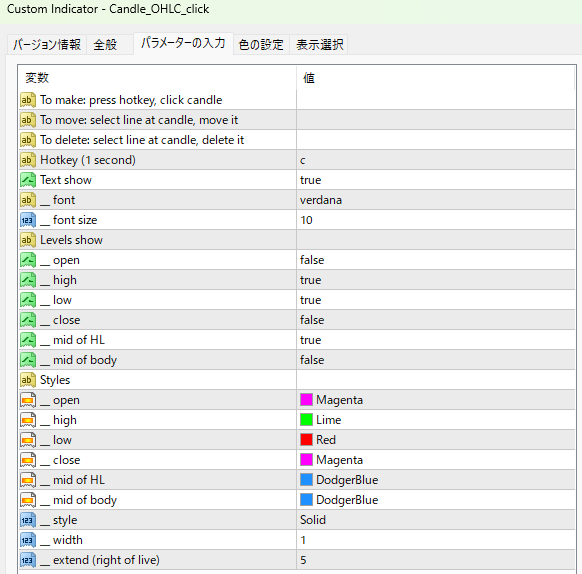ラインタイプ2025.11.24クリックした足の高値や安値などからラインを引く「Candle_OHLC_click」 ポスト シェア はてブ 送る Pocket クリックしたローソク足の高値、安値などから水平線を表示するインジです。使い方としては、チャートにインジをセットした状態で、キーボードの「c」を押した状態で、任意のローソク足を左クリックします。 デフォルトでは高値、安値、半値からのラインになりますが、設定で始値、終値、実体部分の半値など、色々と指定できます。また、描画したラインは価格などのラベルも付きますので、視覚的にもわかりやすいです。特にオーダーブロックを囲う際などに役立つでしょう。パラメーター設定 Candle_OHLC_clickのダウンロード関連記事足の値幅が簡単に分かる「VLine_at_x_candle_v1.3」2025.10.22関連記事指定した時間の足からラインを引く「Candle_Target_Price_Line」2025.10.09関連記事指定した期間の高値と安値をラインで示す「VLine_at_x_candle_v1.1」2025.06.02トレード手法10個+インジをプレゼントします!!当サイト経由でXMのリアル口座を開設された方に、非常に優位性の高いトレード手法を10個+他では絶対に手に入らない自作インジケーター等をまとめたサイト「Forex Standard Club XM版」にご招待します。詳しくはこちらインジケーターのインストール方法インディケーターをダウンロードします。ダウンロードするファイルはzip形式です。zipファイルを解凍し、mq4もしくはex4のインディケーターファイルを取り出します。MT4を起動して、画面左上の「ファイル」より「データフォルダを開く」をクリックします。その中の「MQL4」フォルダを開いた先にある「Indicators」フォルダの中にインディケーターを入れます。MT4を再起動すると、インストールしたインジケーターが表示されますのでそれを選択すればチャート上に表示することが出来ます。詳しい導入方法は以下の記事をご覧ください。関連記事MT4にカスタムインジケーターを追加する方法2024.02.19