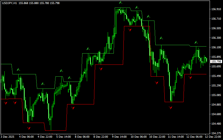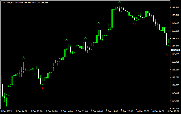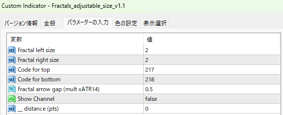 一般的なフラクタル系のインジだと、例えばパラメーターを2にすると、左右の2本の足と比較して真ん中の足が一番高ければ高値のサインが出ます。