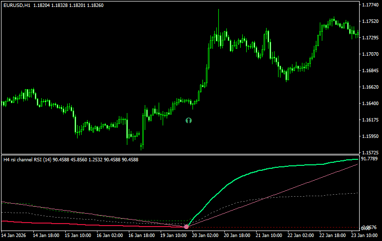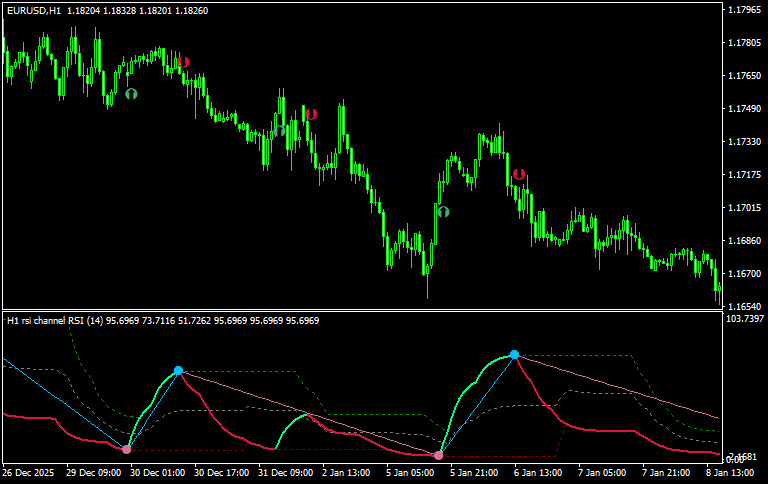 他にもマルチタイムに対応しており、上位足のRSIとチャネルを表示することもできます。