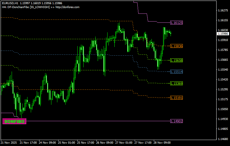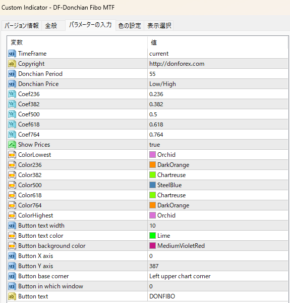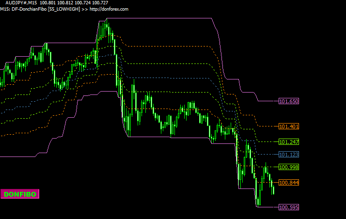 ドンチャンチャネルを表示して、その中にフィボナッチ数で分割したラインを表示するインジです。
