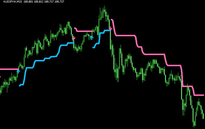 スーパートレンドやストップ系のインジの一部で、現在の価格から一定値離れたところにラインが描画され、足の実体とクロスした所でトレンド転換となります。