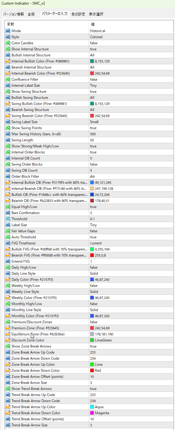 一つのインジで様々な分析が可能で、メジャースイング、インターナルスイング、オーダーブロック、FVG、当日や当週の高値安値ラインなどを設定から選択して表示できます。