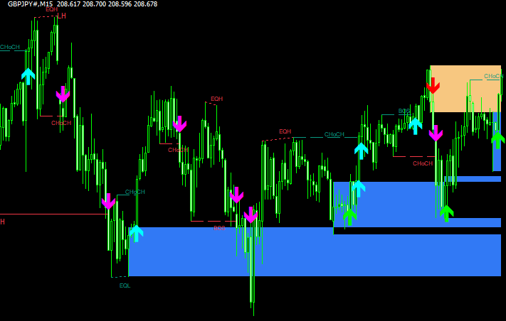 トレンド方向のブレイク時のBOS、トレンドが反転した時のCHOCH、その中の小さなインターナルスイングのbosやchochもしっかり表示しますので、大きな流れの中で、現在はどのような動きになっているかも