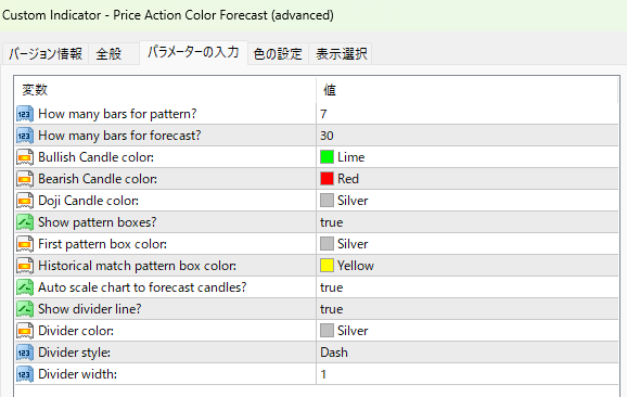 デフォルト設定では直近7本の足で30本先の値動きまで予測します。