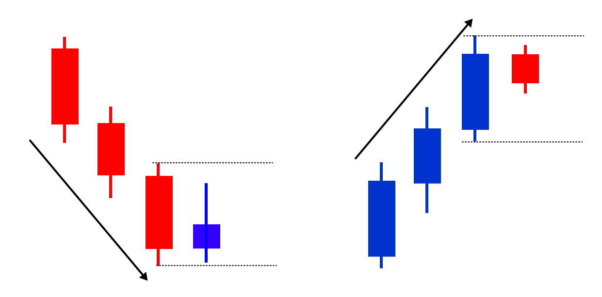 高値や安値を更新する動きが続いて、最後に逆向きではらみ足が出たら反転パターンとなります。