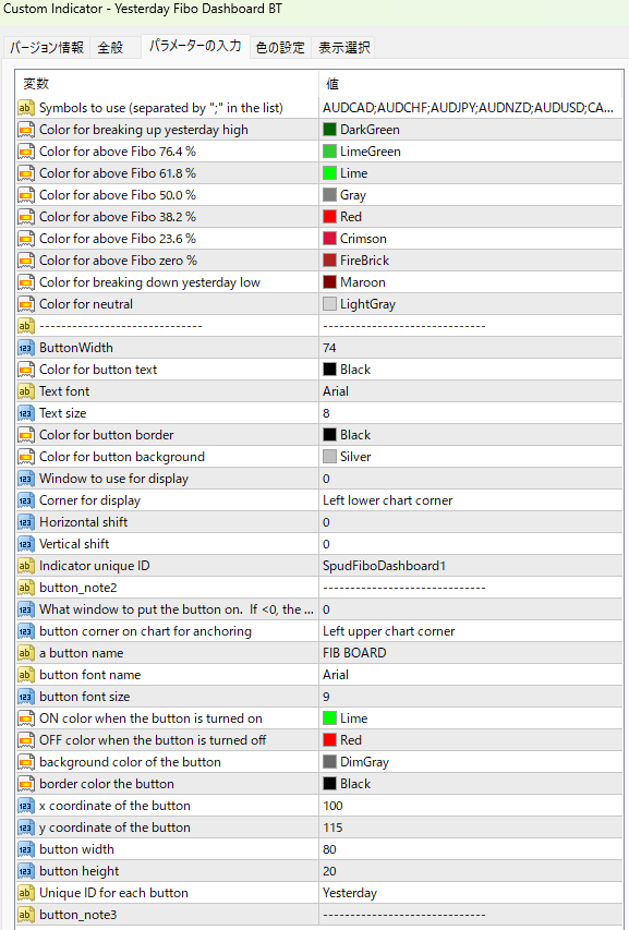 前日の価格と比較して現在の動きがどの辺にあるかを示す「Yesterday Fibo Dashboard BT」