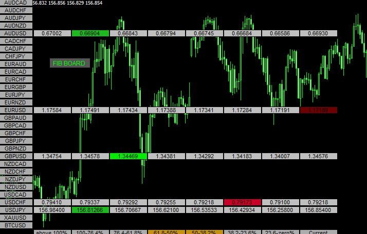 現在の価格が、パネル上のフィボナッチのレートの上、もしくは下にあるとそのパネルに色がついて教えてくれます。