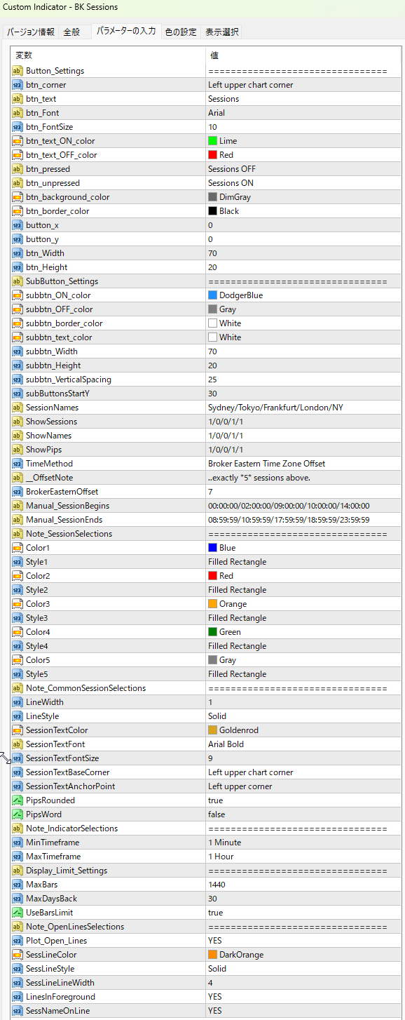 チャート左上には各セッション名のボタンが表示され、それをクリックすることで任意のセッションの時間帯を表示できます。
