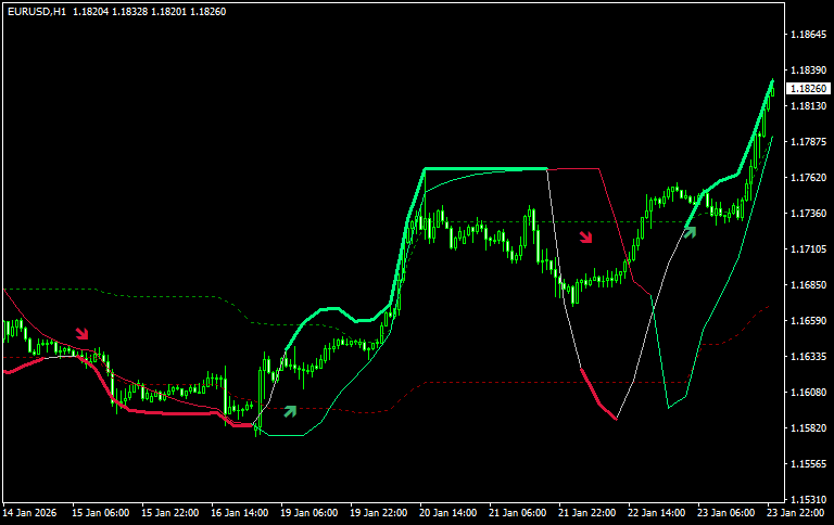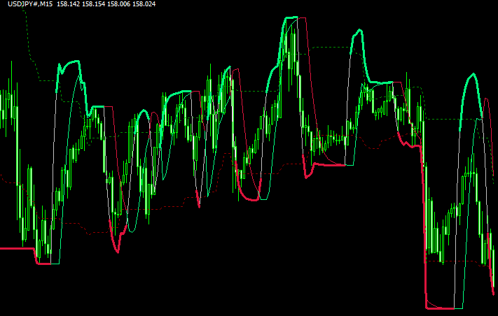 そしてチャネル内を上下する色の変わるラインがシャフの値で、チャネルをブレイクすると色が太く変わり、上限や下限に来ていることを示します。