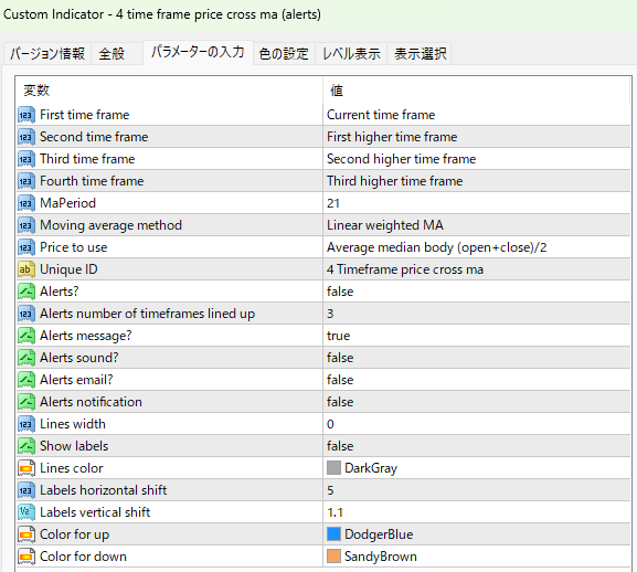 また、時間足については下から現在の足、1つ上の足、2つ上の足、3つ上の足となっていますが、これも変更できます。