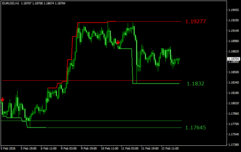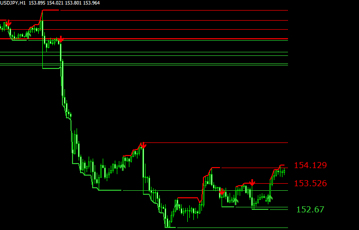 上昇トレンドであれば赤いライン、下降トレンドであれば緑のラインが表示され、トレンドが変わったタイミングでチャネルから水平線が表示されます。