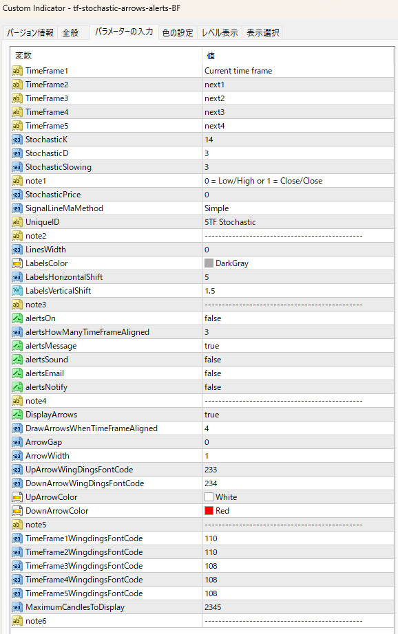 デフォルトでは4つの時間足で方向が同じならサインが出ますが、ここも設定で変更できます。(Draw Arrows When Time Frame Alighned)