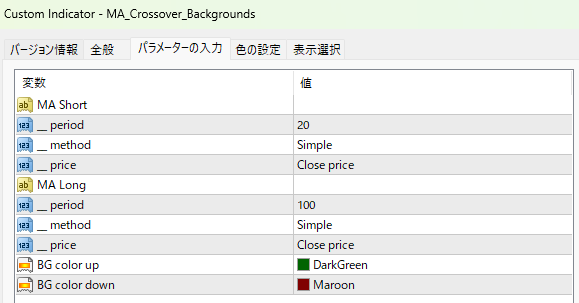 2本のMAを表示し、それらがクロスすると背景色が変わるインジです。