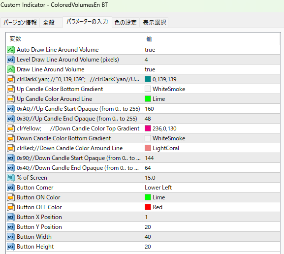 しかし、このインジを使うことで陽線と陰線の時のボリュームの色分けしてみることができますし、チャート左下のボタンをクリックすると表示のオンオフも可能です。