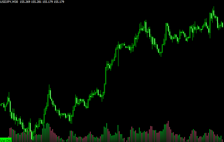 デフォルトのMT4でも同様にローソク足の下部にボリュームを表示できますが、その場合は以下のように緑一色のバーのみが表示されるだけとなります。