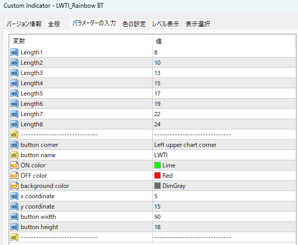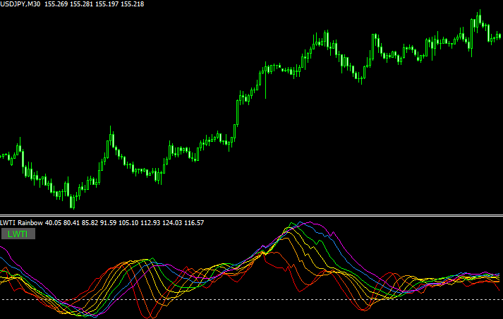 このインジでは同時に8つの期間のLWTIを表示しますので、短期から長期にかけてのトレンドの推移が視覚的に分かりやすくなります。