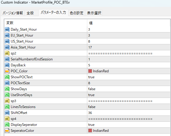 デフォルト設定では過去5日分の値動きについてマーケットプロファイルを表示しますが、設定で変更可能です。