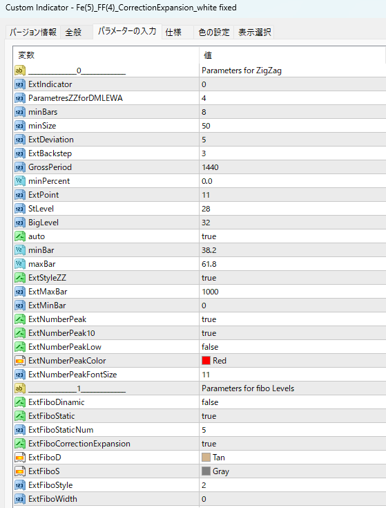 ラインタイプ2026.03.26ピッチフォークをベースにした「Fe(5)_FF(4)_CorrectionExpansion_white fixed」 ポスト シェア はてブ 送る Pocketアンドリューズ・ピッチフォークをベースにして様々なラインを描画するインジです。ピッチフォークについては以下の記事からご覧ください。自動でピッチフォークを描画する「Auto Pitchfork」ピッチフォークの外側に水平や斜めのラインなど、ブレイク後の到達点や反転ポイントを探る際に使える情報も表示します。かなり設定項目があって中身を全部理解するのは難しいですが、興味のある方は使ってみると良いでしょう。パラメーター設定 Fe(5)_FF(4)_CorrectionExpansion_white fixedのダウンロード トレード手法10個+インジをプレゼントします!!当サイト経由でXMのリアル口座を開設された方に、非常に優位性の高いトレード手法を10個+他では絶対に手に入らない自作インジケーター等をまとめたサイト「Forex Standard Club XM版」にご招待します。詳しくはこちらインジケーターのインストール方法インディケーターをダウンロードします。ダウンロードするファイルはzip形式です。zipファイルを解凍し、mq4もしくはex4のインディケーターファイルを取り出します。MT4を起動して、画面左上の「ファイル」より「データフォルダを開く」をクリックします。その中の「MQL4」フォルダを開いた先にある「Indicators」フォルダの中にインディケーターを入れます。MT4を再起動すると、インストールしたインジケーターが表示されますのでそれを選択すればチャート上に表示することが出来ます。詳しい導入方法は以下の記事をご覧ください。関連記事MT4にカスタムインジケーターを追加する方法2024.02.19