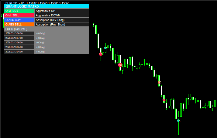 大口の成行注文やストップ注文の連鎖、あるいは市場参加者の注文が吸収されるポイントを統計的に検出し、チャート上に可視化するインジケーターです。